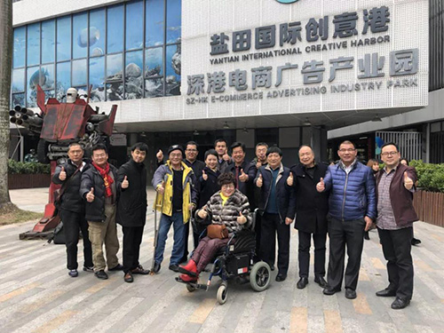 2018年2月5日,深圳市残疾人联合会副理事长陈维伟、深圳市残疾人企业家协会会长毛卫平一行到灵狮文化集团进行调研交流,调研组一行考察了盐田创意港园区,并在会议室听取了介绍和交流。集团执行总裁唐英、副总经理潘俊鑫接待陪同。